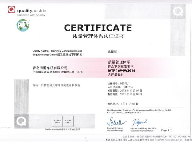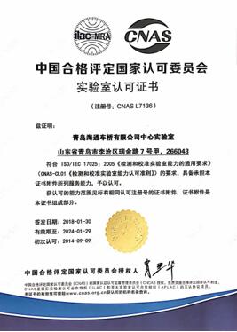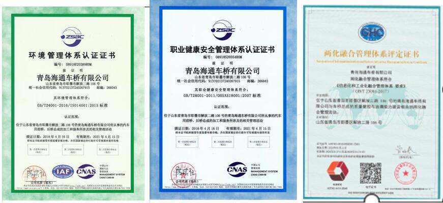 青島海通車橋有限公司成立于1994年,注冊資金2000萬元,位于山東省青島市即墨區(qū)解放二路106號。公司先后獲得“中國誠信企業(yè)”、“國家級認(rèn)可實驗室”、“高新技術(shù)企業(yè)”、“山東省企業(yè)技術(shù)中心”、“山東省守合同重信用企業(yè)”、“山東省著名商標(biāo)”、“質(zhì)量信用AAAAA級企業(yè)”、“AAA級企業(yè)信用等級”等榮譽(yù)。先后通過了質(zhì)量、環(huán)境、職業(yè)健康安全、兩化融合等管理體系認(rèn)證。
